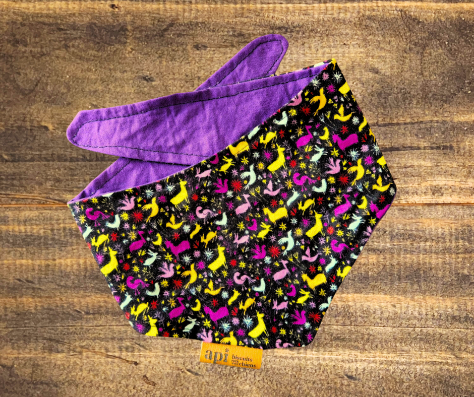 Découvrez nos foulards pour chiens, conçus et cousus avec amour à Shannon, Québec. Chaque pièce est faite à la main, avec des matériaux de qualité et une attention aux détails, pour ajouter style et confort à vos animaux. Choisissez parmi des motifs uniques et des couleurs vibrantes, et soutenez l'artisanat local en optant pour nos produits durables.